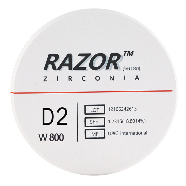 Заготовки из диоксида циркония, стабилизированного иттрием, для стоматологических реставраций по технологии CAD/CAM с принадлежностями: Диск из диоксида циркония Razor 800 монохромный, диаметр 98 мм, толщина 16 мм, оттенок: D2, в составе: - Диск одного оттенка в индивидуальной упаковке – 1 шт., - Инструкция по применению (вкладыш) – 1 шт.