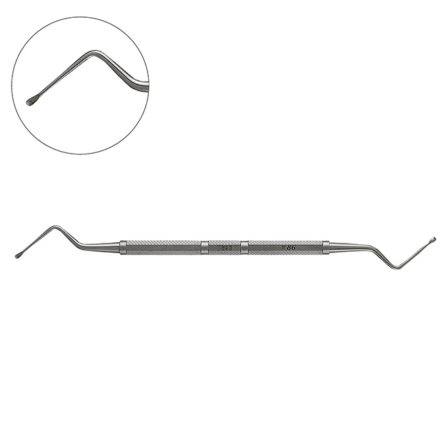 Инструменты стоматологические режущие и ударные с острой (режущей) кромкой с принадлежностями 4. Ложка кюретажная 14318, изогнутая, тип SSW #86, размеры кончика рабочей части 2 х 4 мм, изготовлена из нержавеющей стали, автоклавирование при 135°С.
